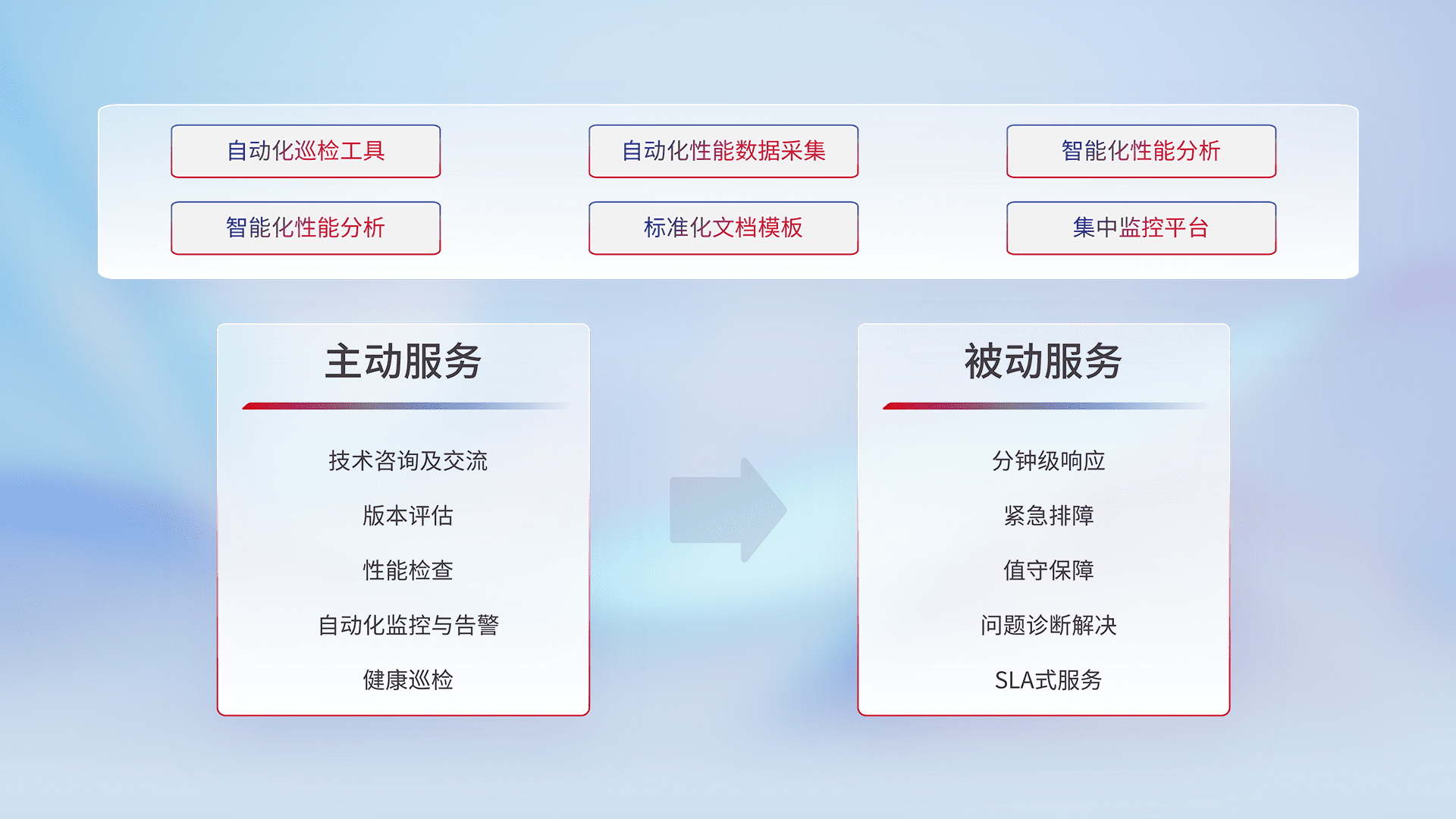 智能化工具和标准化文档,,保障服务质量,,,提供主动服务(包含技术咨询、、、、版本评估、、、性能检查、、、、自动化监控与告警、、健康巡检)和被动服务包含(分钟级响应、、、、紧急排障、、值守保障、、、问题诊断解决、、、SLA服务)。。。。